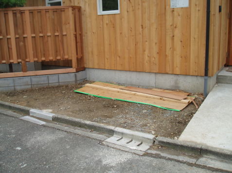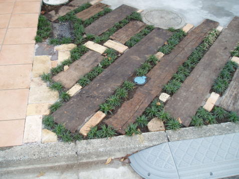 ・古びたイメージと言う事で枕木、ポイントでアンティークレンガを入れて施工しました。植栽は自分ですると言うことでしたが、車の通る部分は玉りゅうくらいしか育たないので玉りゅうは植栽しました。玉りゅう以外はお客様が植栽しました。近所で好評の庭だそうでお客様にも喜んで頂けました。