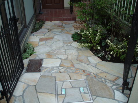 玄関前を所々植栽。やっぱり、石張りだけより緑が所々入ると良いですね。