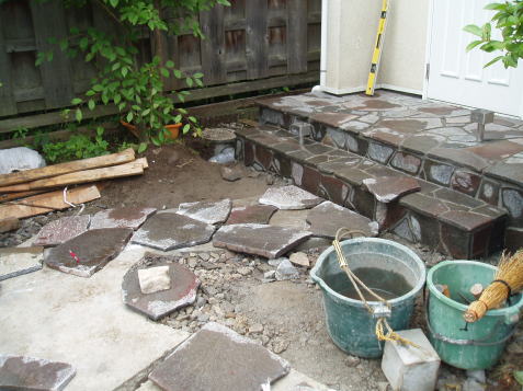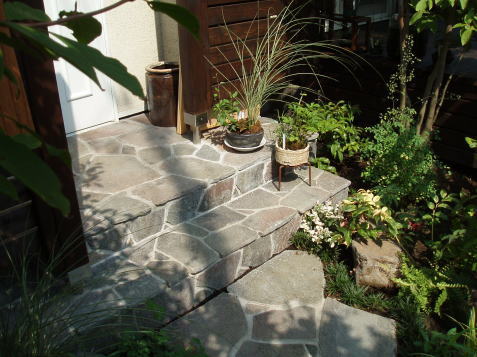 ウッドデッキ・フェンスを造って高低差を出して、アプローチは佐久石で石張りにしました。施主様にも満足していただきました。
