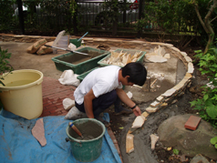 ・石の裏側にモルタルを流し込みしっかり固定。